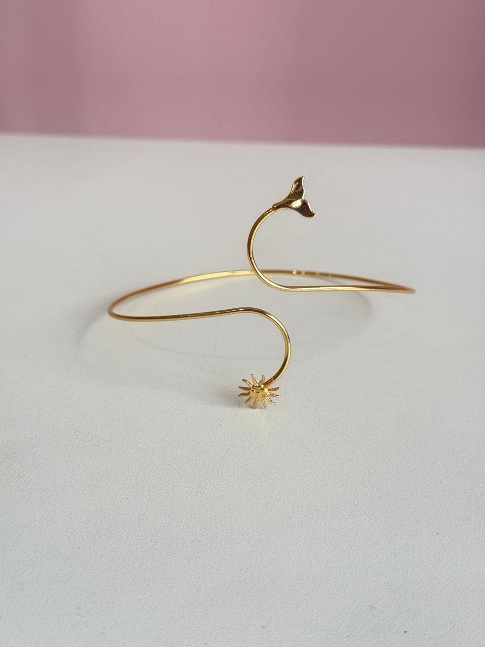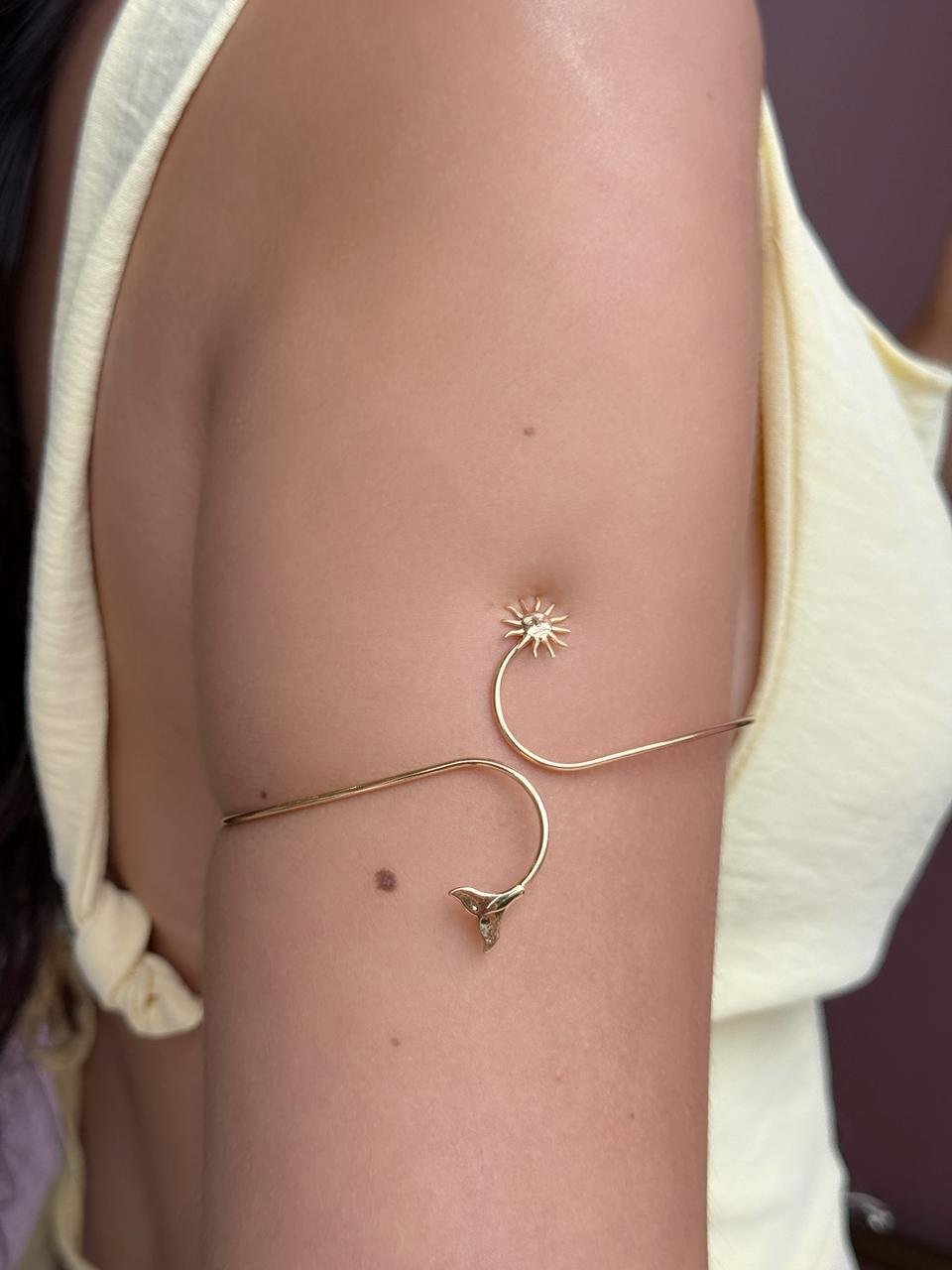 O Bracelete de Antebraço Sereia Solar é uma bijuteria elegante e cheia de personalidade. Seu design diferenciado combina o sol e a cauda de sereia, criando uma peça única que transmite luz, movimento e inspiração no universo do mar.