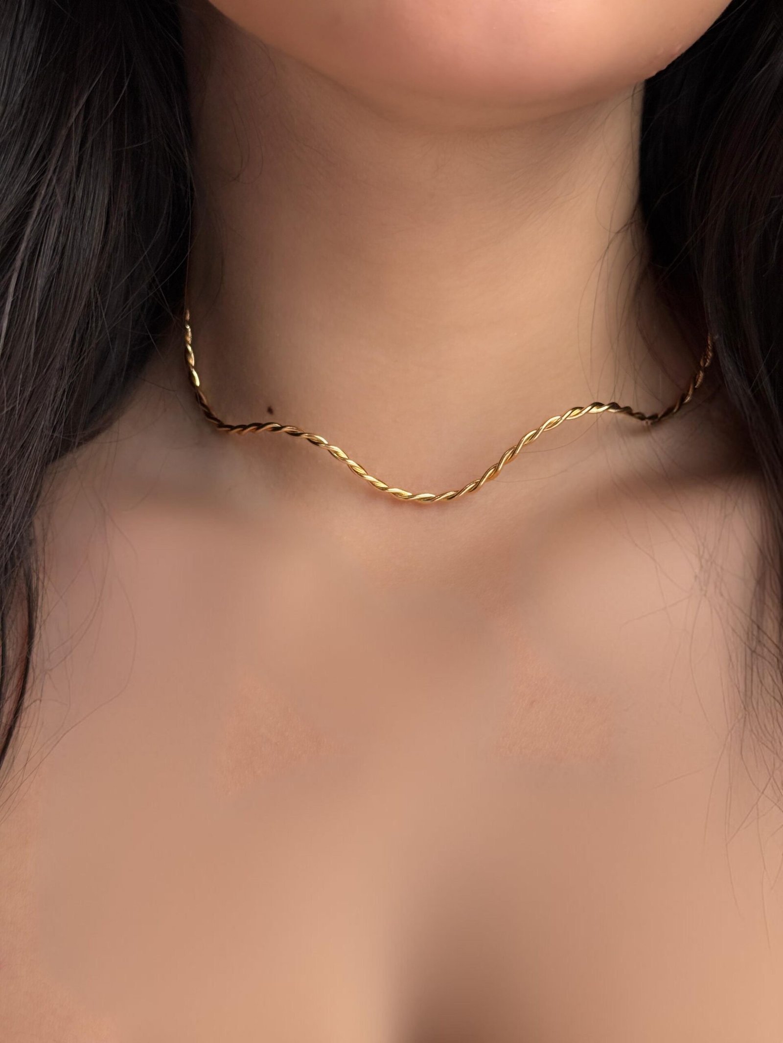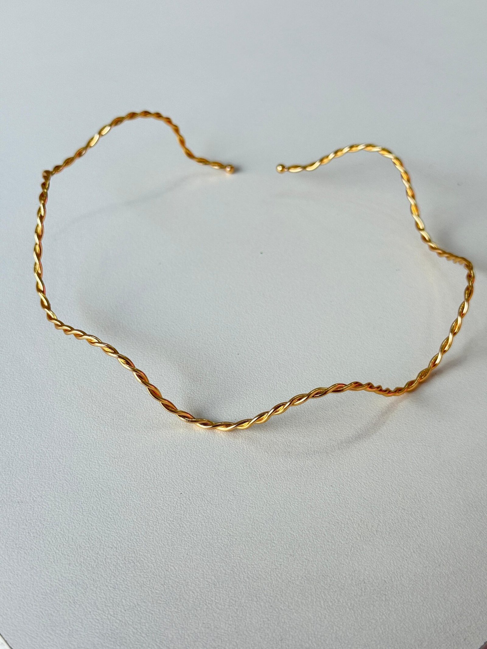 A Choker Aro Torcido Ondulado Dourado é a escolha perfeita para quem busca elegância com personalidade. Seu design em aro rígido, com torções e ondulações delicadas, cria um efeito moderno e sofisticado, destacando o colo de forma marcante.