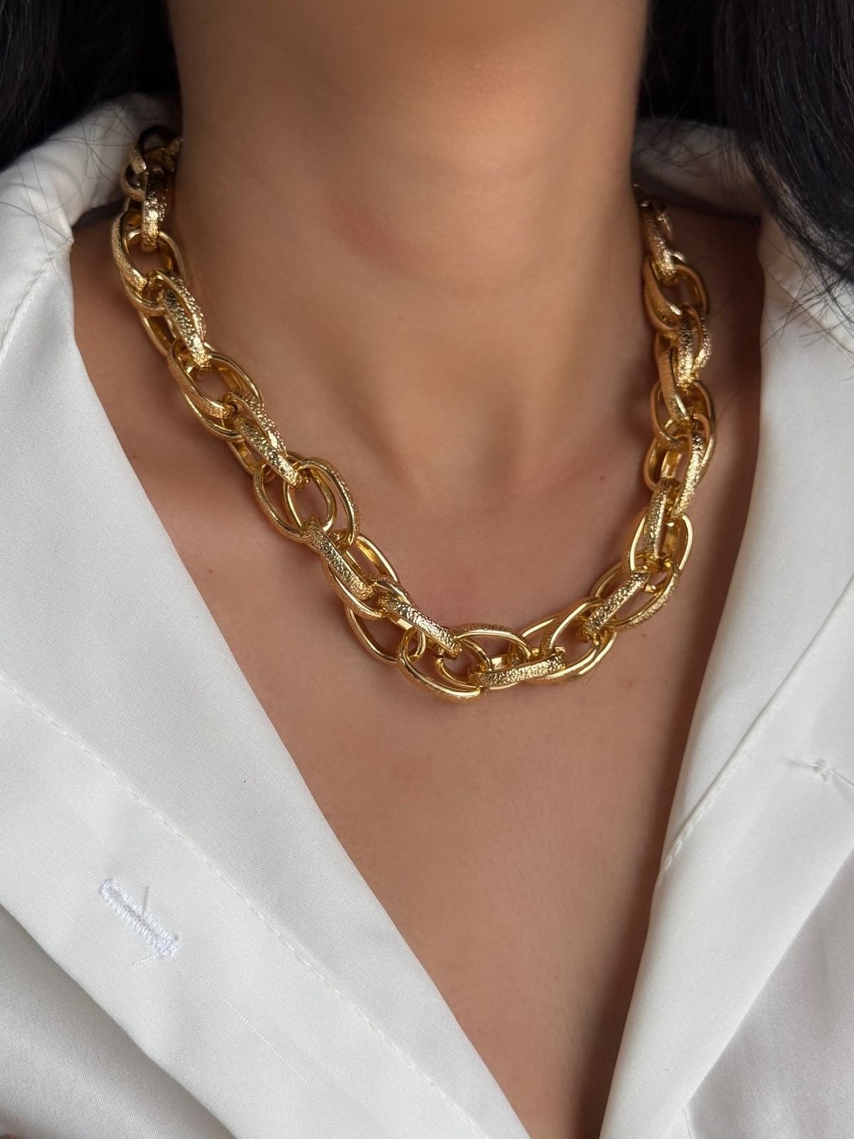 Colar com corrente de elos grandes e design moderno, composto por elos lisos e texturizados que criam um visual sofisticado e cheio de estilo. A peça possui acabamento dourado, trazendo destaque e elegância para qualquer composição. Versátil, pode ser usada sozinha como peça principal ou combinada em mix de colares. Possui extensor que permite ajustar o comprimento conforme a preferência.