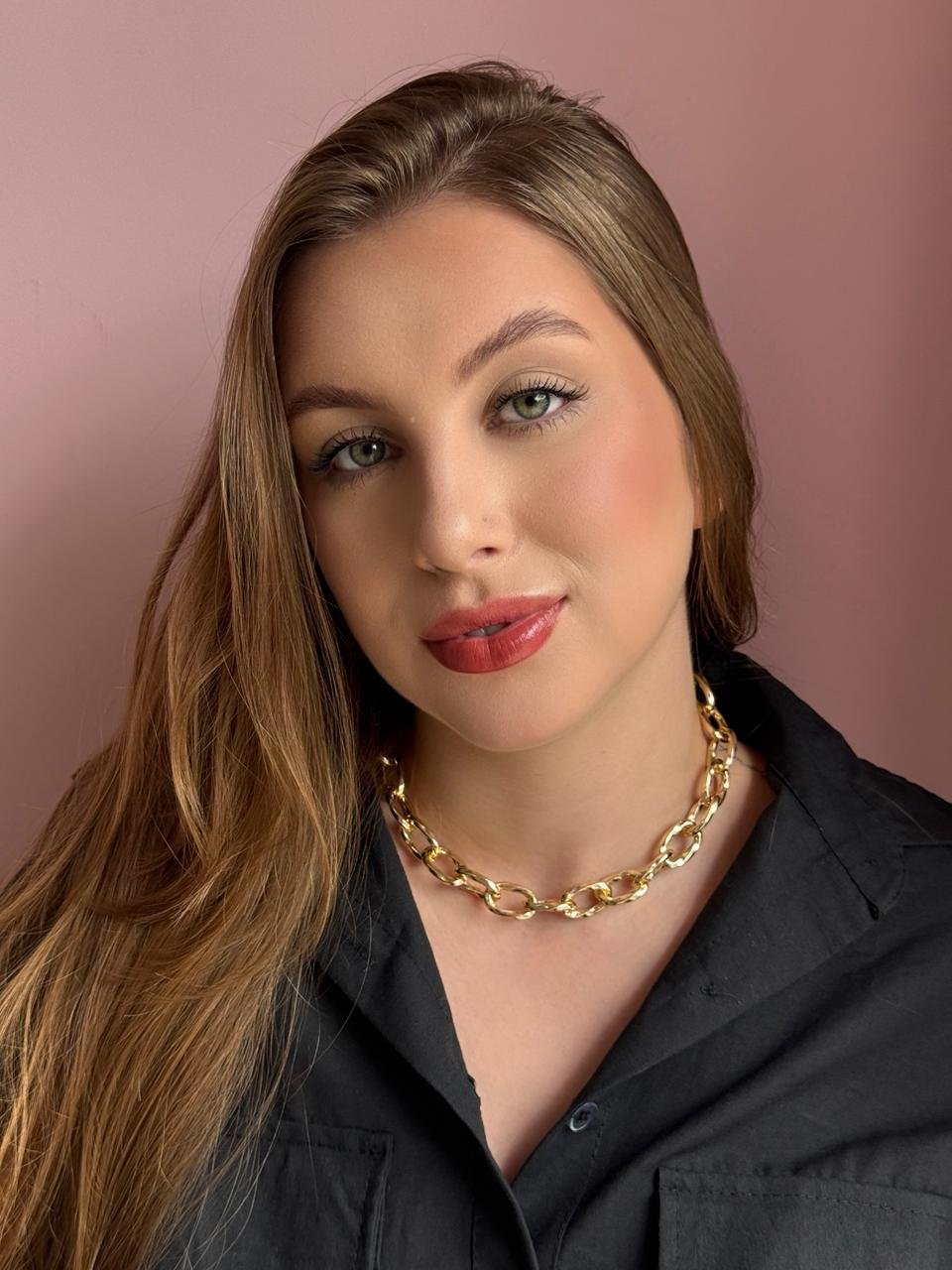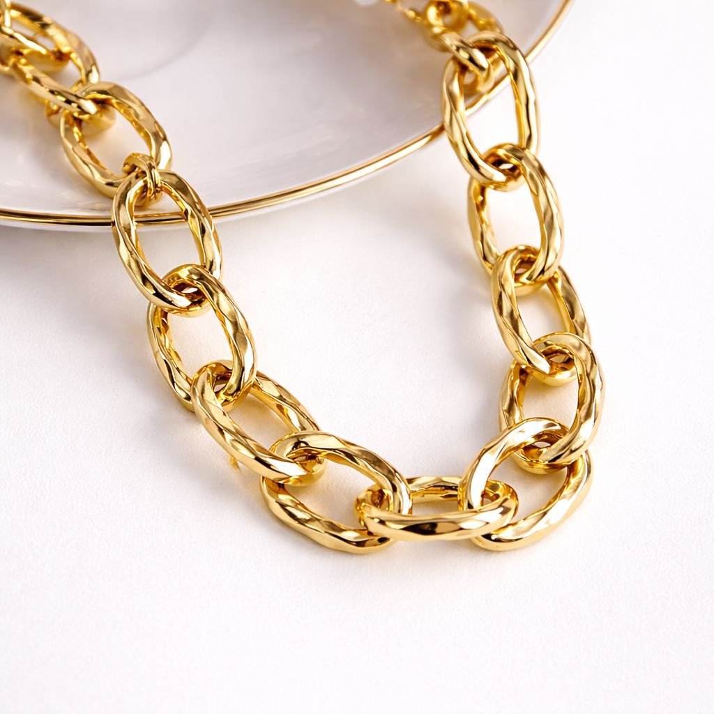 Colar com corrente de elos torcidos e design moderno, que traz movimento e elegância à peça. O acabamento dourado destaca o formato diferenciado dos elos, criando um visual sofisticado e marcante.